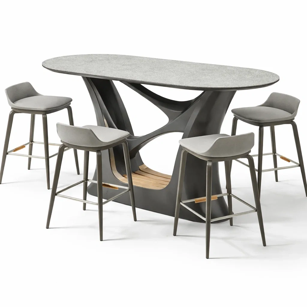 Ensemble table et chaises de bar ronde en pierre composite avec 4 tabourets en résine grise et aluminium