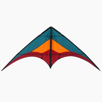 Ce cerf-volant arbore un design dynamique avec des couleurs rouge foncé, orange vif, bleu ciel et turquoise. Sa forme aérodynamique lui permet de monter rapidement avec un vent léger à modéré. Grâce à son cadre en fibre de verre, il résiste bien aux chocs et conserve sa forme pendant le vol.