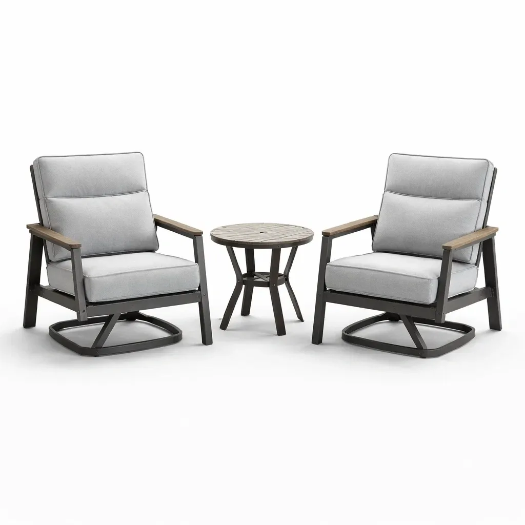 Ensemble de détente en aluminium avec fauteuils pivotants et table ronde en bois