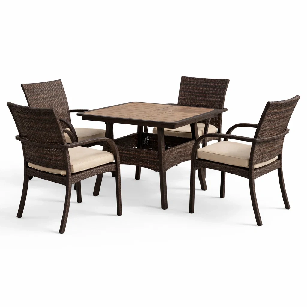 Ensemble table et chaises carrée résine tressée marron avec chaises et coussins beige