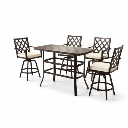 L'ensemble comprend une table en métal avec un plateau en lattes de bois composite et quatre chaises en métal avec accoudoirs.