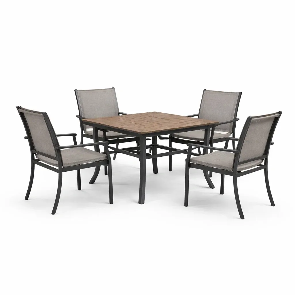 Matériau: Structure en métal, plateau en matériau composite effet bois, assise et dossier en textilène